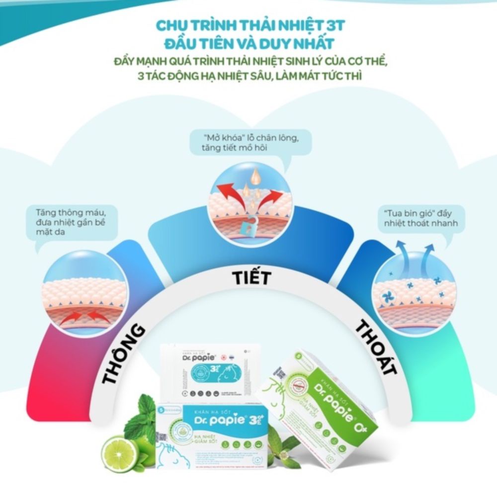 Khăn hạ sốt Dr.Papie hạ sốt tức thì, chuẩn nhi khoa nhờ khả năng làm mát hạ nhiệt nhanh với chu trình thải nhiệt 3T: