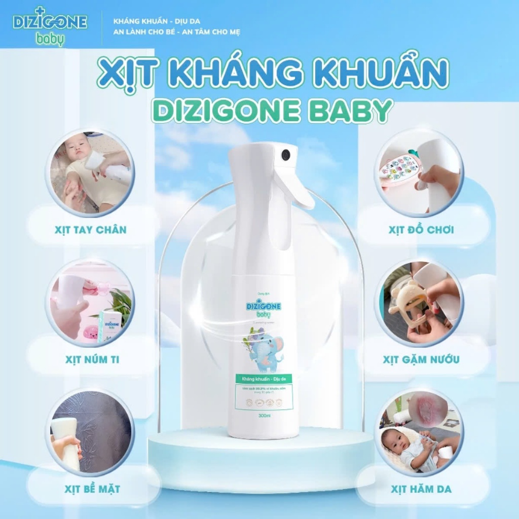 - Để kháng khuẩn phòng bệnh: Xịt trực tiếp Dizigone baby lên tay chân, cơ thể, đồ chơi, đồ dùng hay các bề mặt cần vệ sinh, làm sạch.