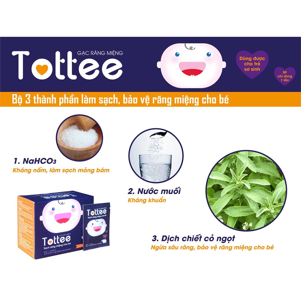 - Gạc rơ lưỡi Tottee được KẾT HỢP BỘ 3 thành phần đã chứng minh an toàn, lành tính với trẻ nhỏ, đó là: